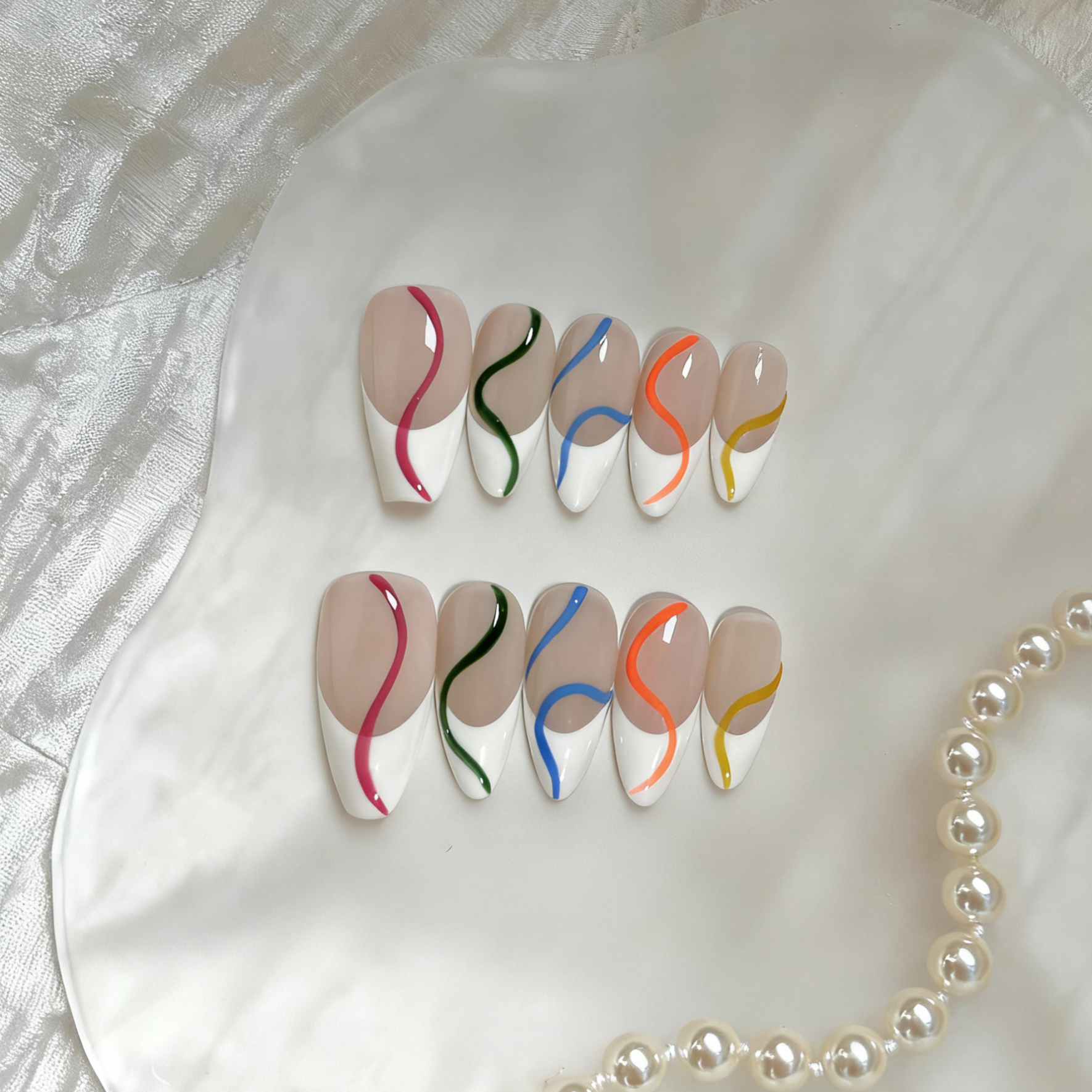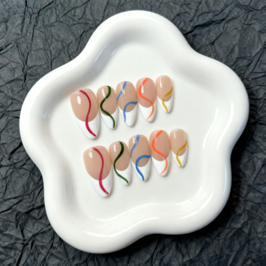 Abstract Color Wave Press-On Nails – Elegant Nude French Tips with Artistic Swirls | Reusable Nail Set
